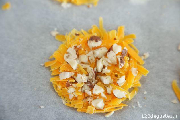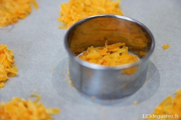 - A l’aide d’un cercle (ou bien sans), déposer la mimolette en petits tas d’une épaisseur de 1 à 2 mm sur le papier