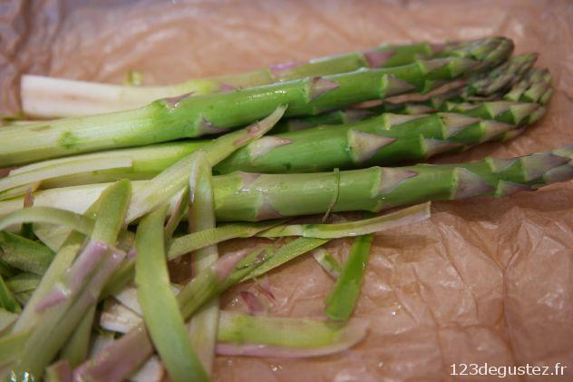 - Eplucher les asperges au couteau économe (généreusement pour ne garder que la partie tendre)