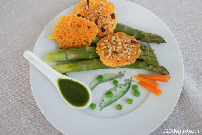 Voici une recette toute simple et rapide avec des asperges vertes cuites à la perfection, une sauce aux herbes et des tuiles à la mimolette vieille ! Un bel accord pour ce légume qui m’est cher !