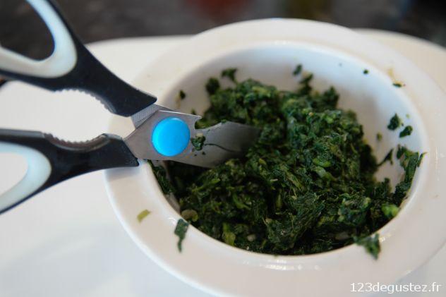 - Une fois refroidis, presser le jus des épinards avec les mains pour les égoutter. Ciseler-les grossièrement avec des ciseaux