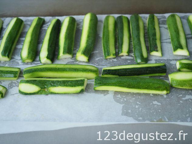 - Poser les ½ courgettes côte à côte sur le côté plat. Faire cuire quelques minutes