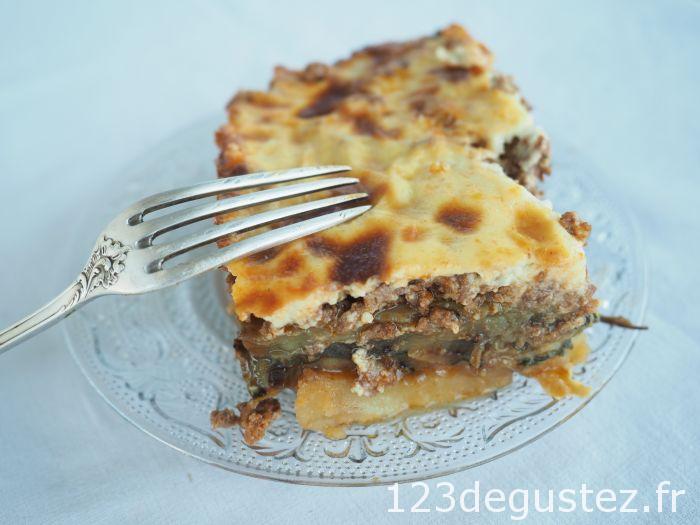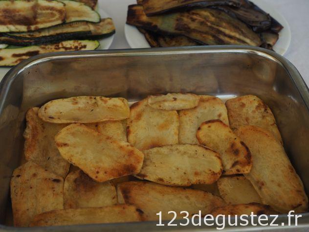 - Faire une couche de pomme de terre en serrant bien. Saler modérément. Ajouter une couche de courgettes. Saler modérément. Ajouter une ou deux couches d’aubergines. Saler modérément. Ajouter la viande avec une écumoire s’il reste du jus de cuisson Ajouter la béchamel en une couche uniforme