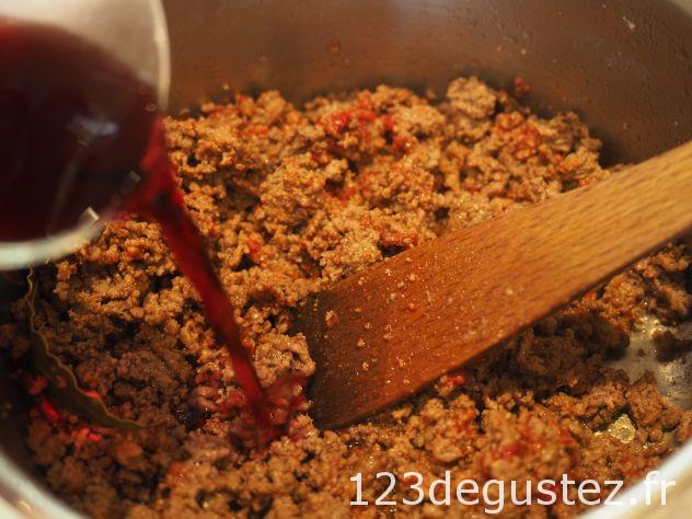 - Ajouter le concentré de tomate et remuer. Ajouter le vin rouge. Faire cuire à feu moyen pendant 20 minutes environ