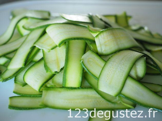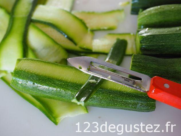 • Continuer à faire des lamelles de courgettes avec le couteau économe, toujours dans le même sens