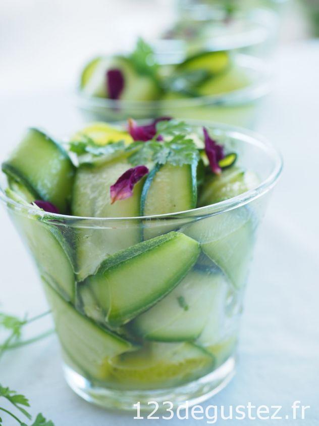 Avez-vous mangé des courgettes crues marinées ? Elles ont un petit gout d’amande, un croquant bien agréable, c’est une entrée parfaite pour l’été. Un plat facile, rapide, sain et diététique. Servies en verrines, pour un apéritif léger et frais, succès assuré !