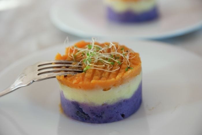 Cet arc en ciel de purée de pomme de terre (Moralisa et Vitelotte) et de patate douce est facile et rapide à faire, avec un cercle en inox.