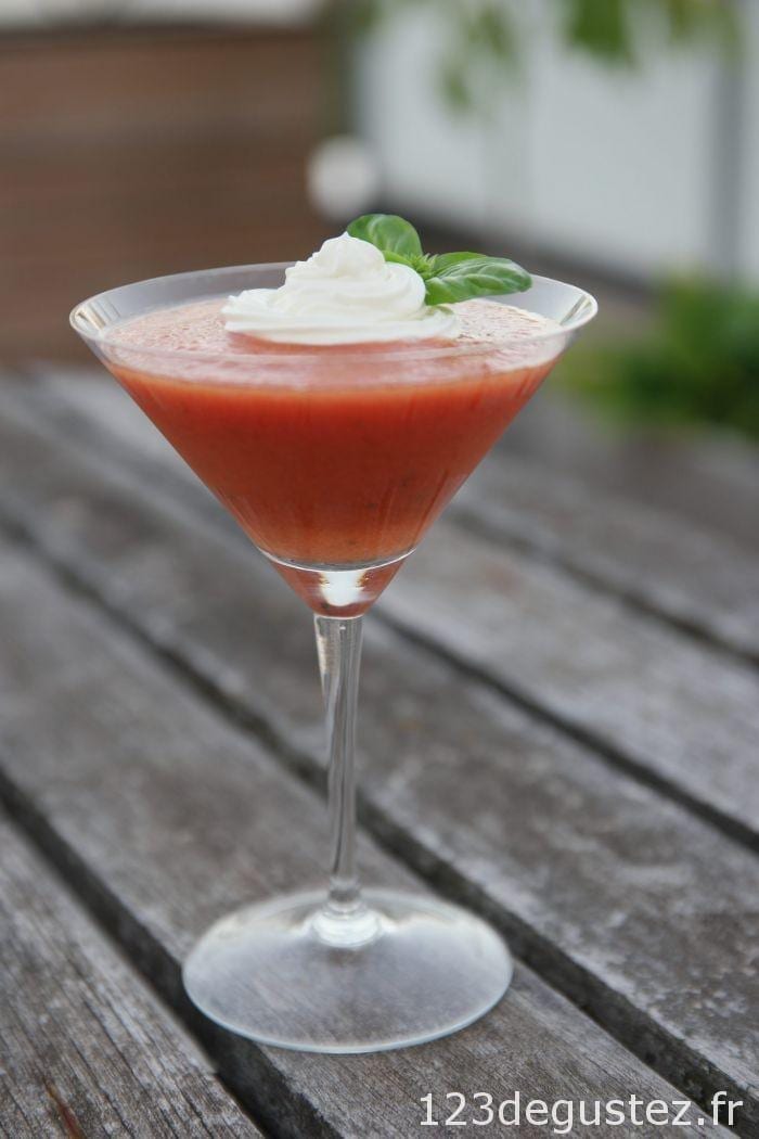 J’ai gouté ce gaspacho de tomate au gorgonzola dans un restaurant à Sète et j’ai trouvé que le mélange du gaspacho avec le gorgonzola était une tuerie.