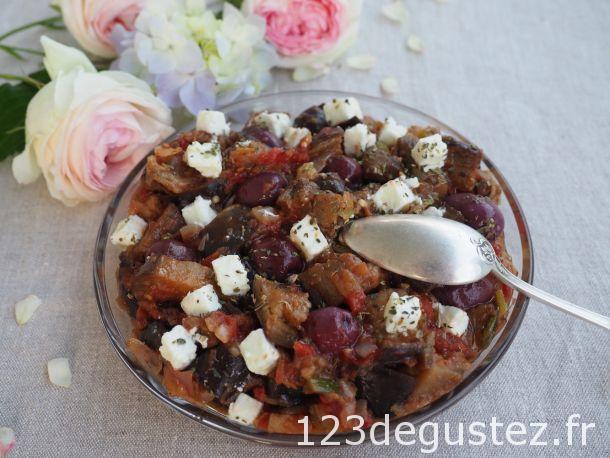 Les aubergines sont fondantes, cette salade est très fraiche, relevée par les olives et la fêta.