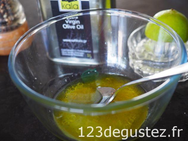 - Préparer la marinade en mélangeant le citron, l’huile d’olive et le poivre