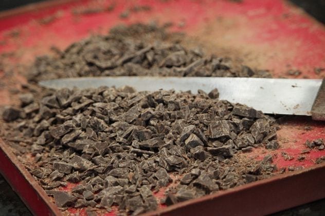 - Couper le chocolat en tout petits morceaux et mettre dans un saladier.