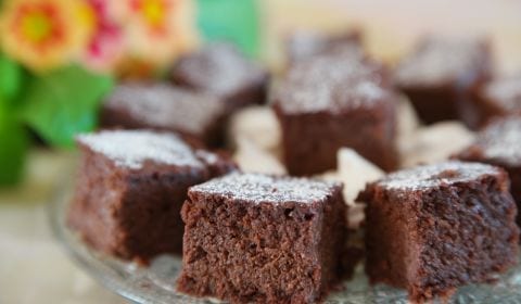 • Une fois le gâteau refroidi, enlever le cadre et couper des carrés. Saupoudrer de sucre glace à l’aide d’une passoire fine