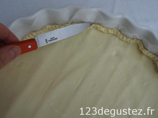 • Dérouler la pâte feuilletée bien froide, dans un grand plat à tarte. Rouler les bords vers l’intérieur, pas besoin d’un grand bord. Avec le dos d’un couteau pointu, chiqueter la pâte tout autour