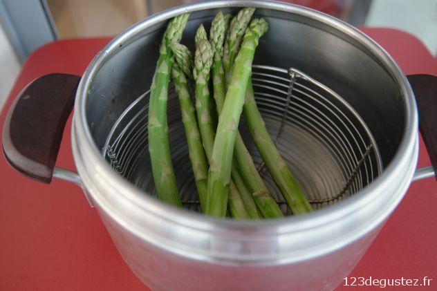 - Eplucher les asperges au couteau économe (généreusement pour ne garder que la partie tendre). Les cuire à la vapeur douce dans un panier pendant 3 à 4 minutes environ selon la grosseur ou au vitaliseur